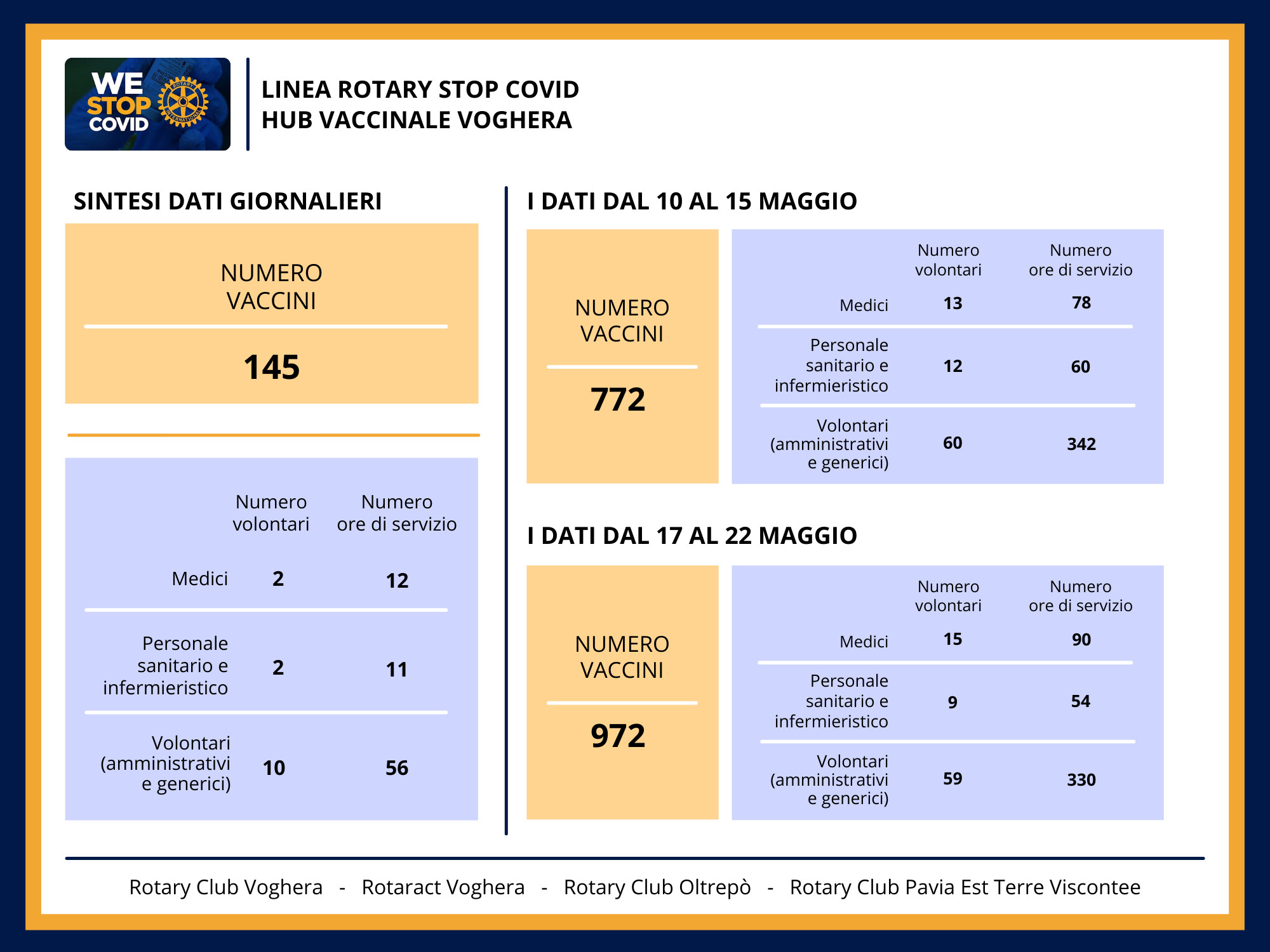 Il Rotary Voghera è stato autorizzato con una apposita convenzione da ASST Voghera a gestire una linea vaccinale denominata "ROTARY STOP COVID" per la quale il Club ha mobilitatao ed organizzato un cospicuo numero di volontari fra medici e altre figure di complemento necessarie per le operazioni amministrative.
